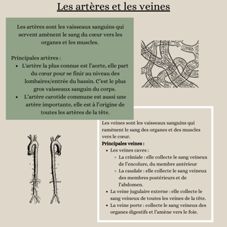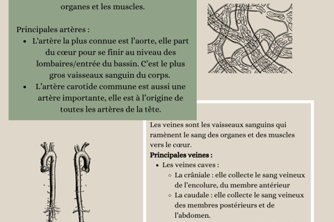 Le sang riche en oxygène part du ventricule gauche du cœur et se distribue aux organes, muscles et tissus par les nombreuse artères qui sortent de l’aorte. Une fois que le sang est passé dans tous les tissus par les artères puis les artérioles et enfin les capillaires, il quitte les capillaires pour se rendre dans les veinules puis les veines pour atteindre l’atrium droit par la veine cave crâniale pour le membre antérieur et la tête ou par la veine cave caudale pour les veines du reste du corps.
