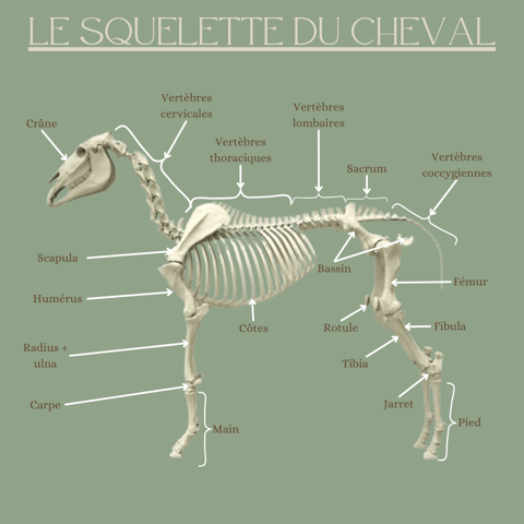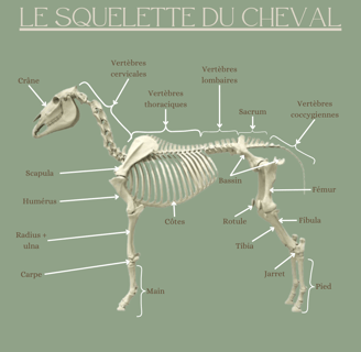 Le cheval a également un squelette composé de 206 os, en revanche, il possède 7 vertèbres cervicales, 18 vertèbres thoraciques, 6 vertèbres lombaires, 5 vertèbres sacrées et 18 vertèbres coccygiennes.