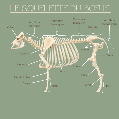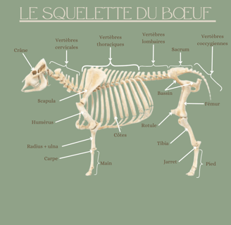 La vache a également un squelette composé de 207 os, en revanche, il possède 7 vertèbres cervicales, 13 vertèbres thoraciques, 6 vertèbres lombaires, 5 vertèbres sacrées et 18 vertèbres coccygiennes.