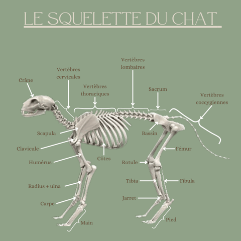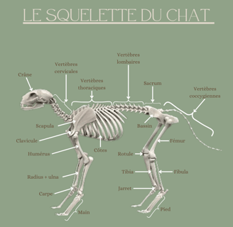 Le chat a un squelette composé d'environ 250 os, il possède 7 vertèbres cervicales, 13 vertèbres thoraciques, 7 vertèbres lombaires, 3 vertèbres sacrées et 20-24 vertèbres coccygiennes.