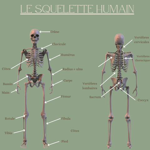 Ainsi, le squelette humain est composé de 206 os avec 7 vertèbres cervicales, 12 vertèbres dorsales/thoraciques, 5 vertèbres lombaires, 5 vertèbres sacrées et 4 vertèbres soudées pour le coccyx. L'Homme ayant 5 doigts, il a donc des phalanges et des métacarpiens supplémentaires par rapport au cheval et la vache sur les main et des phalanges et métatarsiens supplémentaires par rapport à tous les animaux sur les pieds.