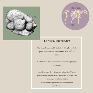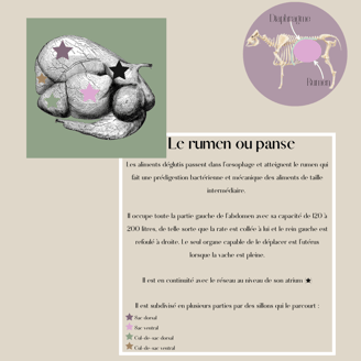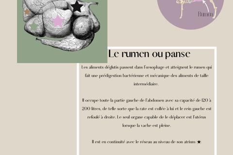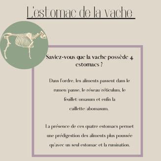 La vache, comme le mouton et la chèvre, sont des Ruminants, ils possèdent tous les trois la particularité d’avoir 4 estomacs avec tous des fonctions bien distinctes dans la prédigestion des aliments.